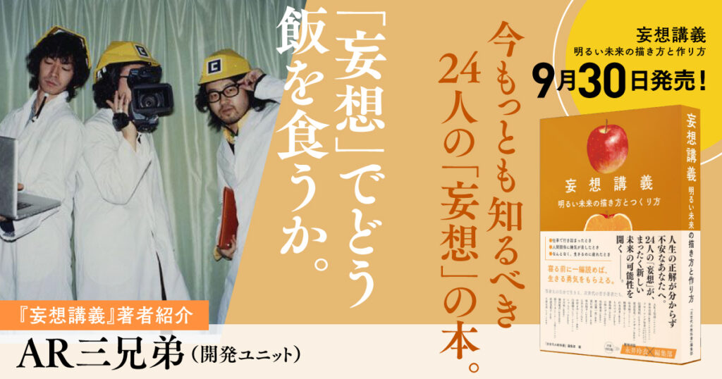 AR三兄弟というユニット名はすでに決めてあった。ARという当時まだ目新しかった技術用語と、身近だけど実際には周りにそんなに存在しない三兄弟という言葉の連立。最初に思いついた十個のネタを実装して発表する頃には、いろいろな種類の仕事が舞い込んでいた。白衣とカクメットのユニフォームも早い段階で決めた。三人が同じ格好をしているだけで、ユニット感はましましになる。妄想を形にして一年間で会社から独立、以降十五年間もの間、仕事のオファーが一度も途切れたことはない。この論考は、長男が起点となった妄想をどんな温度感で次男が運用してきたのか。三男はどうやって三兄弟を離れたりまた戻ったり続けたりしているのか。兄弟リレー方式で筆者を変えながら明らかにしてゆこうと思う。
