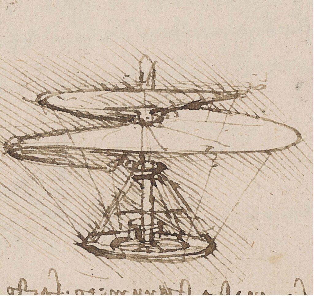 レオナルドが書き残したヘリコプターの図は、螺旋状の翼を脚力で高速回転させ、空気を押し下げて空を飛ぶものです。現在は、レオナルドのヘリコプターは回転翼の反力が考慮されていないため、機体がくるくる回ってしまってうまく飛べないことが分かっています。けれど「脚力を使った人力ヘリコプター」というアイディアは、4枚のプロペラを回す形に修正することで、2013年にトロント大学の研究チームが成功させています。