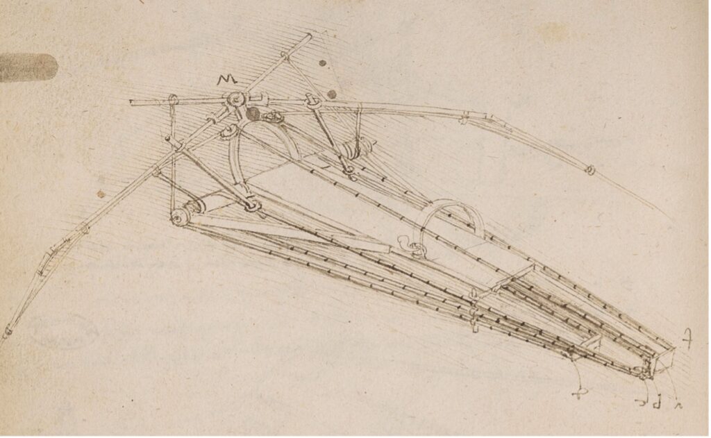 さらに、レオナルドは固定翼で滑空するという概念を、ジョージ・ケイリーよりも300年前に既に持っていました。ヘリコプターのときと同じく、飛行を安定させるために別の翼を付けるというアイディアは持ち合わせていませんでしたが、現代のハングライダーの基礎となる設計を考案していたと言えるでしょう。