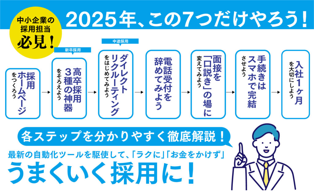 リクルート出身で、中小企業の採用課題の解決を30年以上も行ってきた採用のプロが、2025年度の最新情報に合わせて今日からすぐ使える実践的なポイントをわかりやすく解説。覚えるべきはたったの「7ステップ」。しかも全部お金をかけずに0円からできる!ITやデジタルに頭が痛くなる人も大丈夫。これ一冊読めば、現代の採用に必要なことはすべて学べます!