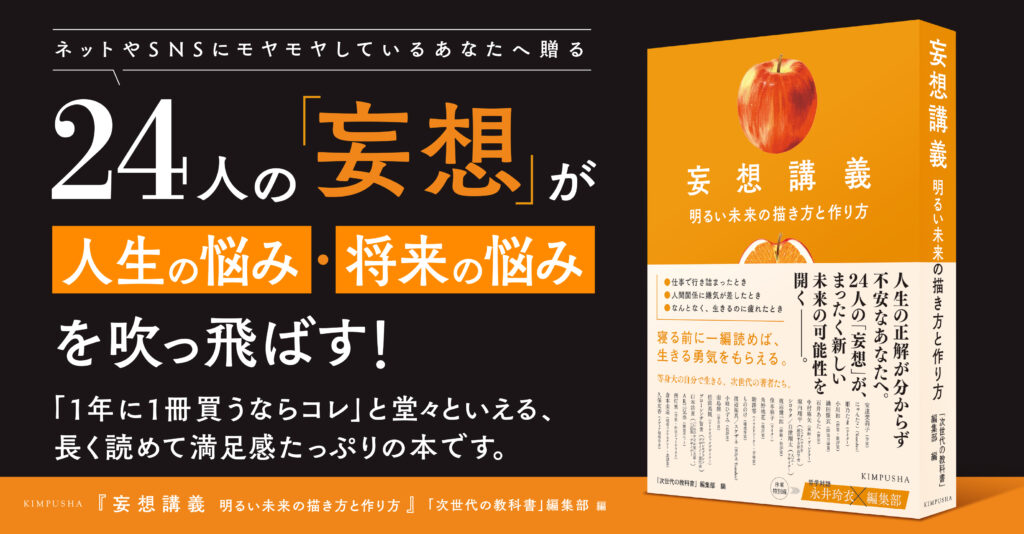 2024年9月30日に発売される『妄想講義 明るい未来の描き方と作り方』(「次世代の教科書」編集部編)。新進気鋭24名の著者が「妄想」をテーマに文章を寄せ合い、まったく新しい未来の可能性を開くオムニバス本である。